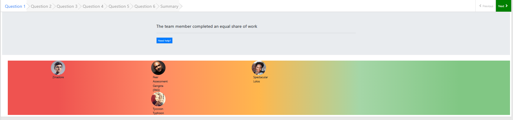 We start with a range-type question where the student is asked assign each team member to a color where red is the minimum assignable value and green is the maximum. The zones that are assignable are configured by the lecturer.