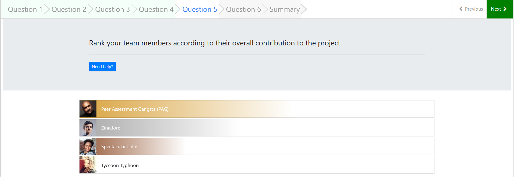 Next type of possible questions is the rank type question. In the range type it is possible to give everyone the same value (i.e. everyone did an excellent job). In ranking however, a distinct choice must be made for each member — which is also why we recommend sparing use of this type.