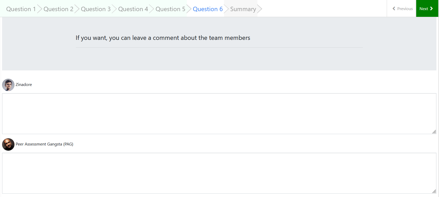 The goal of a peer assessment is to provide some feedback to your teammates but also to the lecturer about how the team is doing. In the following examples I will have multiple questions in each assessment but that is all configurable by the lecturer at any point, and the goal should be to have a very short to complete form.