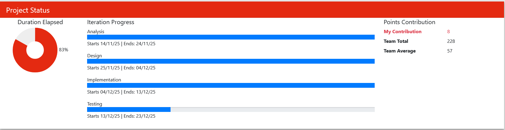 The above image shows a possible example of our imaginary Web Development class. All data has been auto-generated for demo purposes. Students also get an overview of the project’s progress as shown below. The iterations are dynamically defined by the lecturer and should be made to fit the desired educational outcomes.